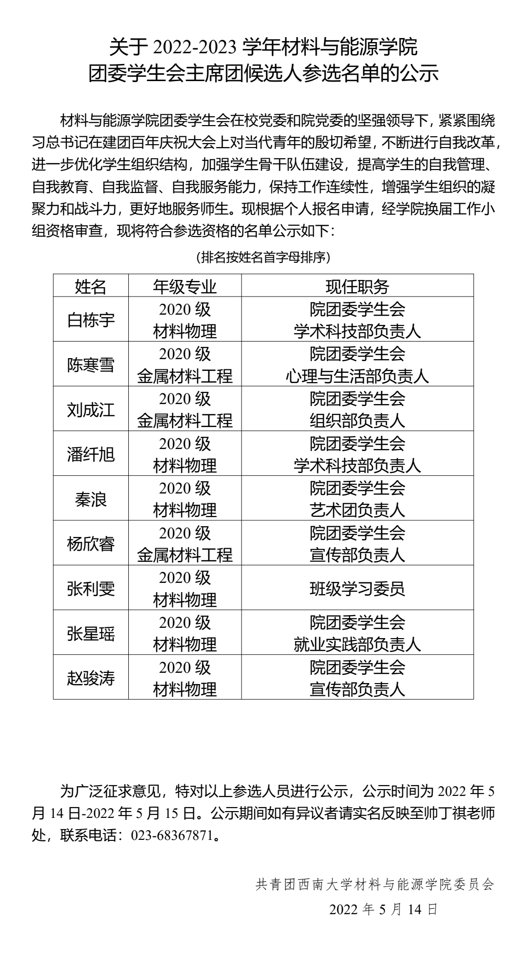 2022-2023学年太阳成集团tyc539团委学生会主席团候选人参选名单公示