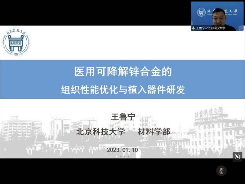 1月10日下午,北京科技大学副校长王鲁宁教授应邀为太阳成集团tyc539全体师生做线上报告。王教授以材料前期的成分设计、力学性能改良以及后期的生物医用相关性能评价反馈为主线介绍了Zn-Li及Zn-Mn可降解锌合金设计与制备的系统性研究成果,同时就如何解决锌合金中第二相粗大的关键问题、锌合金表面粗糙度致塑性的创新性研究成果进行了阐述。报告内容详实、观点深刻富有见解、与会人员受益匪浅。在接下来的提问环节中,王鲁宁教授也一一为大家答疑解惑。线上互动气氛热烈、与会师生反响热烈。通过本次交流,王教授给学院师生带来了最新的学术前沿知识以及宝贵的科学研究经验,将为学院金属生物医用材料研究方向的发展起到积极的推动作用。