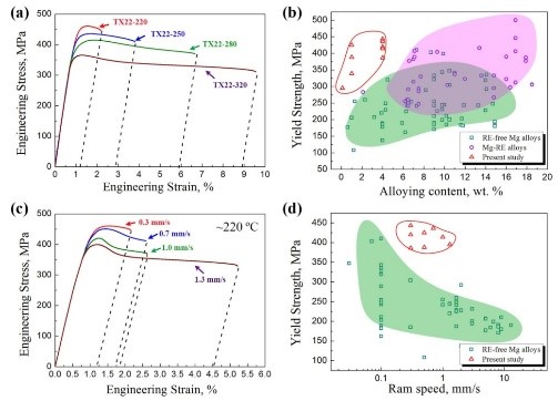 报告摘要:受到产品成本以及国家战略性稀土资源受控等因素的限制,工业界对于低成本、不含稀土元素的高性能镁合金的需求愈显迫切。以Al、Zn、Sn等为主要合金元素的非稀土镁合金,其第二相在常规时效过程中的形核率低,分布不均匀,强化效果不理想。最近,在镁合金相平衡及热力学计算的基础上,成功预测并开发了新型的Mg-Sn-X(Ca、Y、Zn、Mn)系列变形镁合金。其中Mg-Sn-Ca合金表现出优异的强度性能,其屈服和抗拉强度最高达到了443 MPa和460MPa。较常规挤压或轧制制备的非稀土镁合金以及稀土镁合金均有很大优势。作为一种新型的高强变形镁合金,Mg-Sn-Ca系合金取得了较大突破。