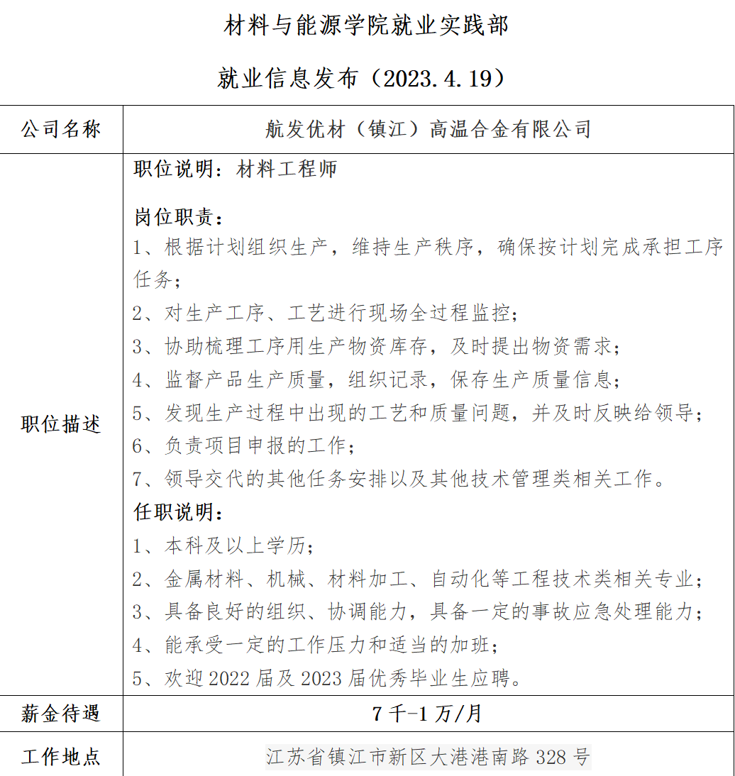 就业信息发布(2023.4.19)—航发优材(镇江)高温合金有限公司