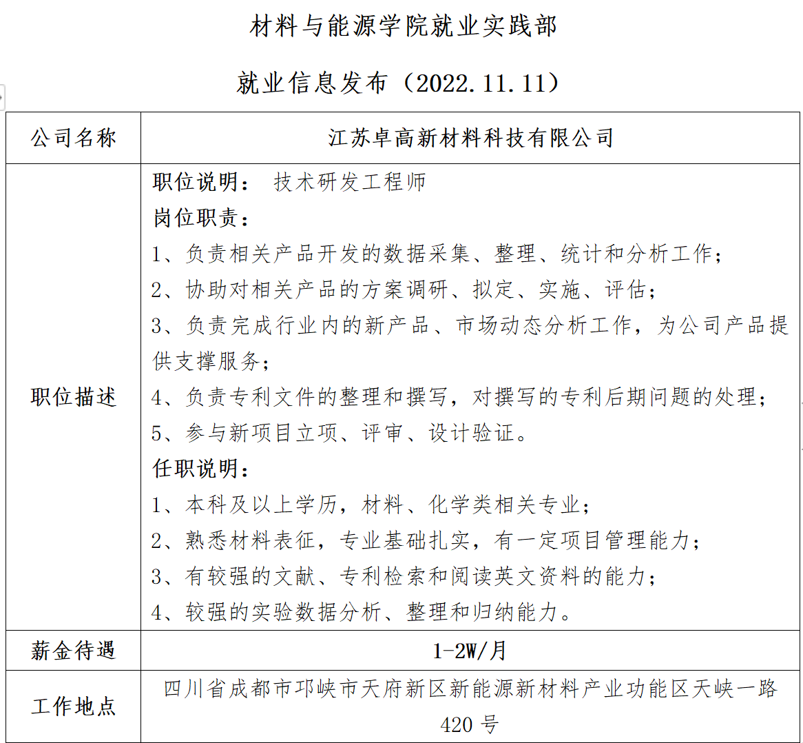 就业信息发布(2022.11.11)—江苏卓高新材料科技有限公司(1)