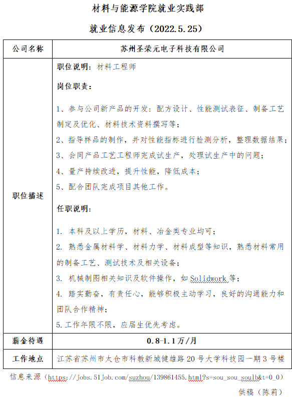 就业信息发布2022.5.25—苏州圣荣元电子科技有限公司