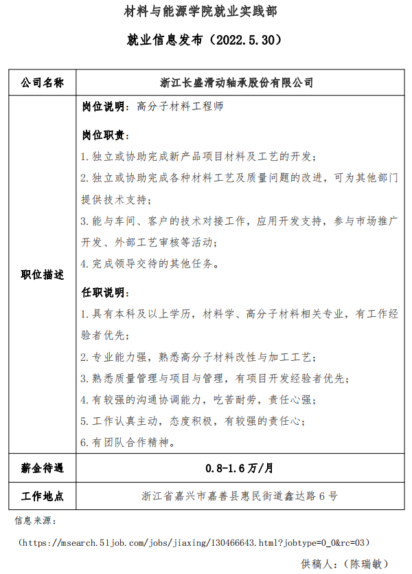 就业信息发布(2022.5.30)—浙江长盛滑动轴承股份有限公司