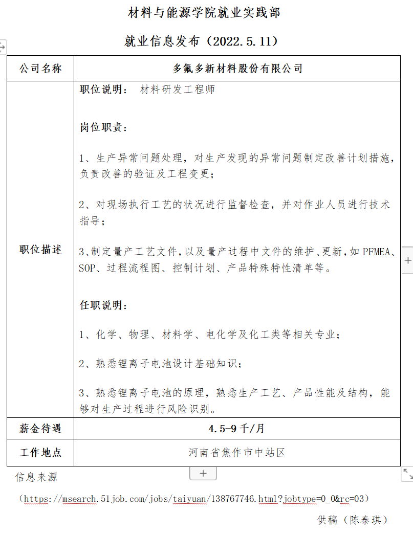 就业信息发布(2021.5.11)—多氟多新材料股份有限公司
