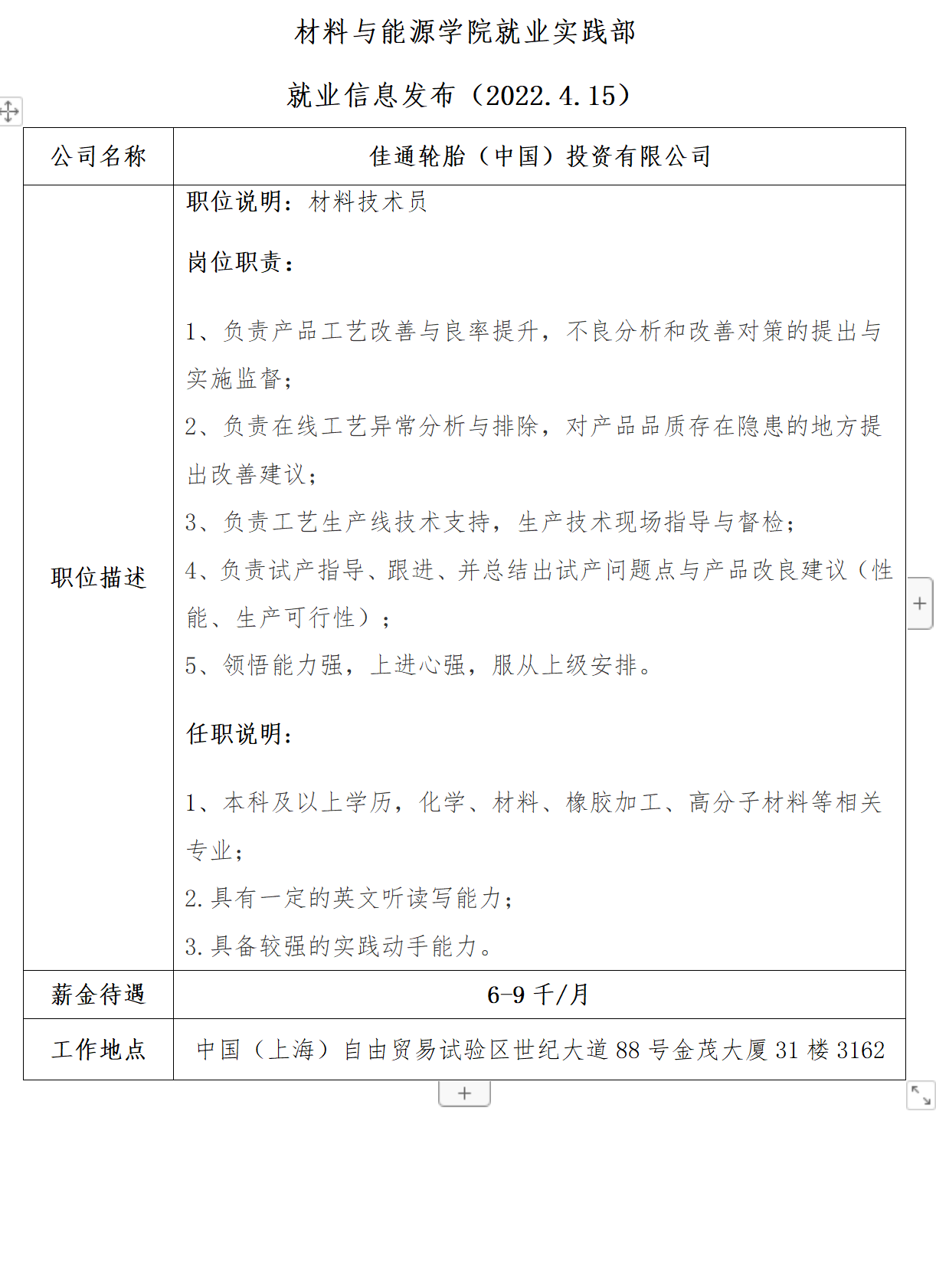 就业信息发布2022.4.15—佳通轮胎(中国)投资有限公司