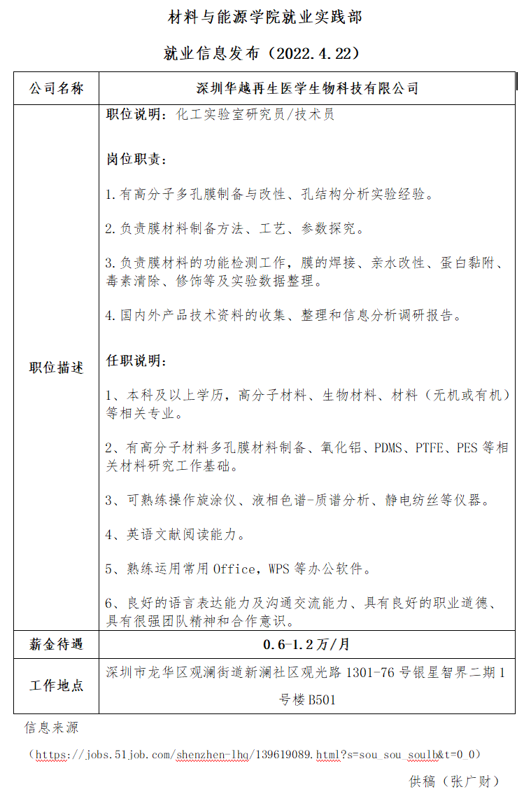 就业信息发布(2022.4.22)—深圳华越再生医学生物科技有限公司