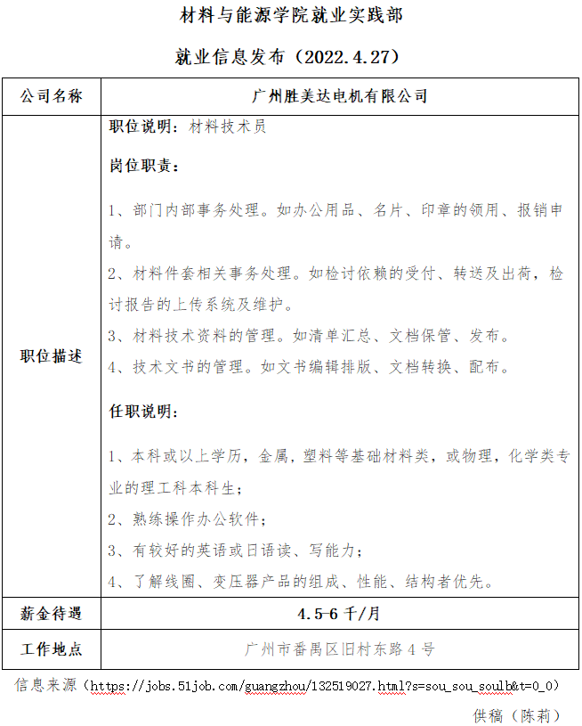 就业信息发布2022.4.27—广州胜美达电机有限公司
