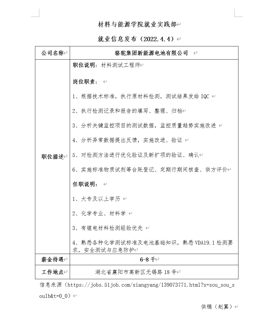 就业信息发布(2022.4.4)——骆驼集团新能源电池有限公司