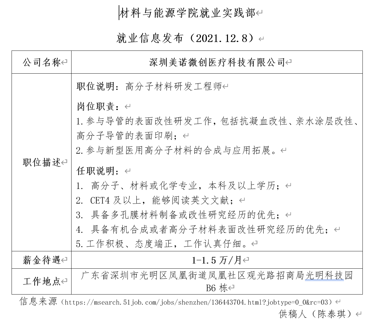 就业信息发布(2021.12.8)——深圳美诺微创医疗科技有限公司
