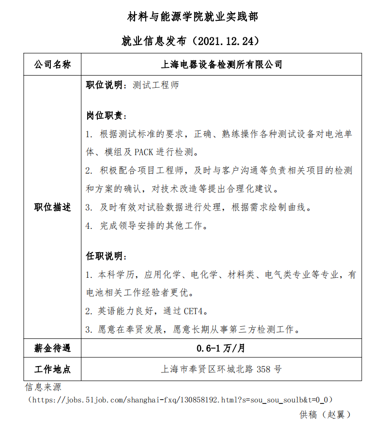 就业信息发布(2021.12.26)—上海电器设备检测所有限公司