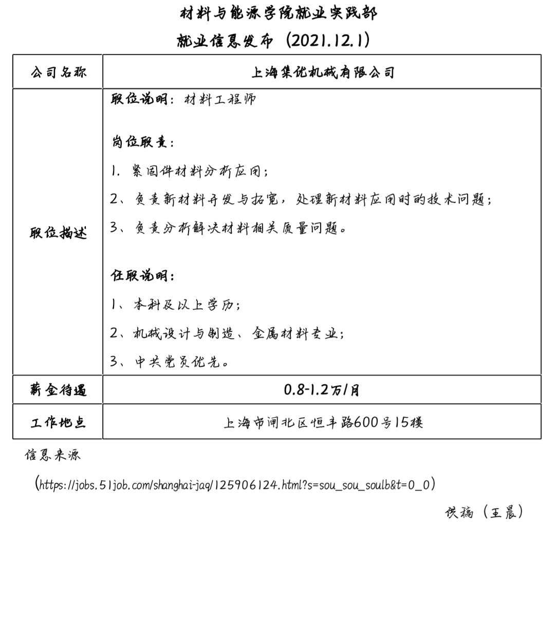 就业信息发布(2021.12.2)——上海集优机械有限公司