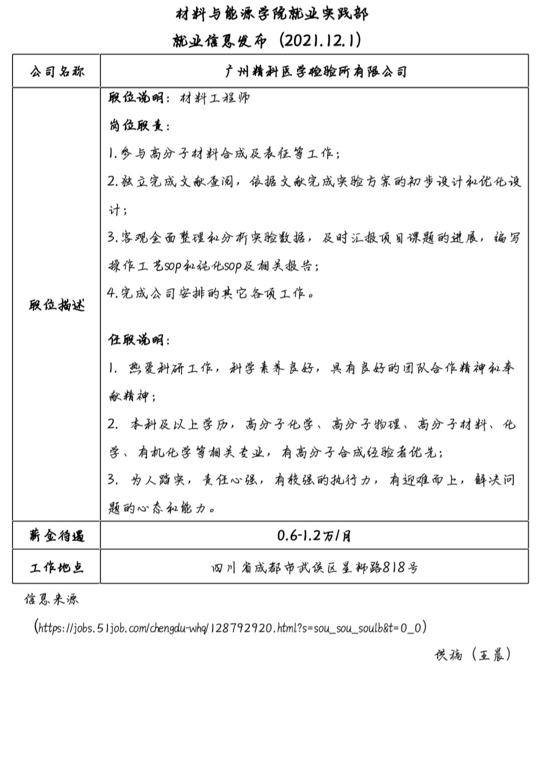 就业信息发布(2021.12.2)——广州精科医学检验所有限公司