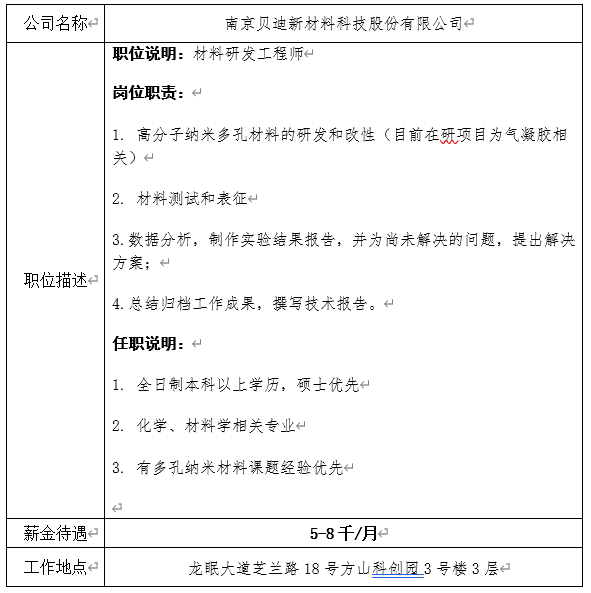 就业信息发布2021.3.31-南京贝迪新材料科技股份有限公司