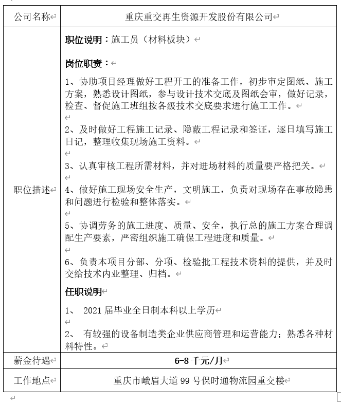 就业信息发布2021.3.5--重庆重交再生资源开发股份有限公司