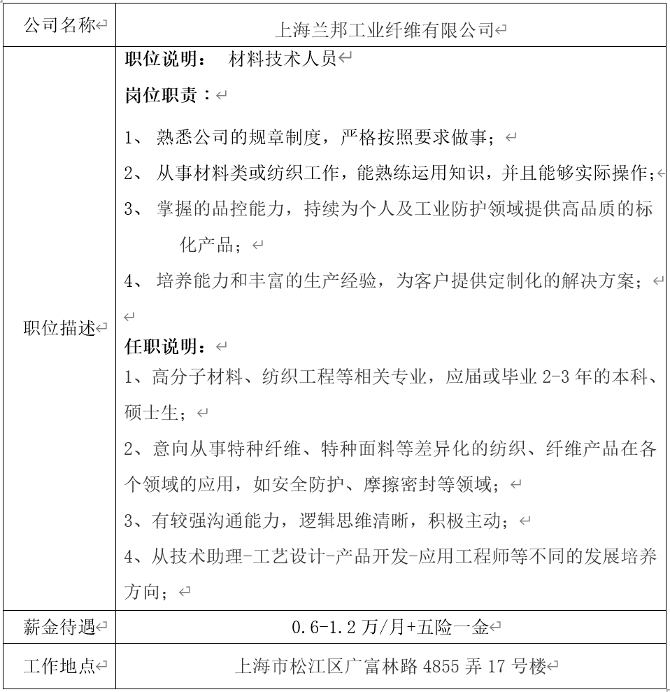 就业信息发布2021.1.2—上海兰邦工业纤维有限公司