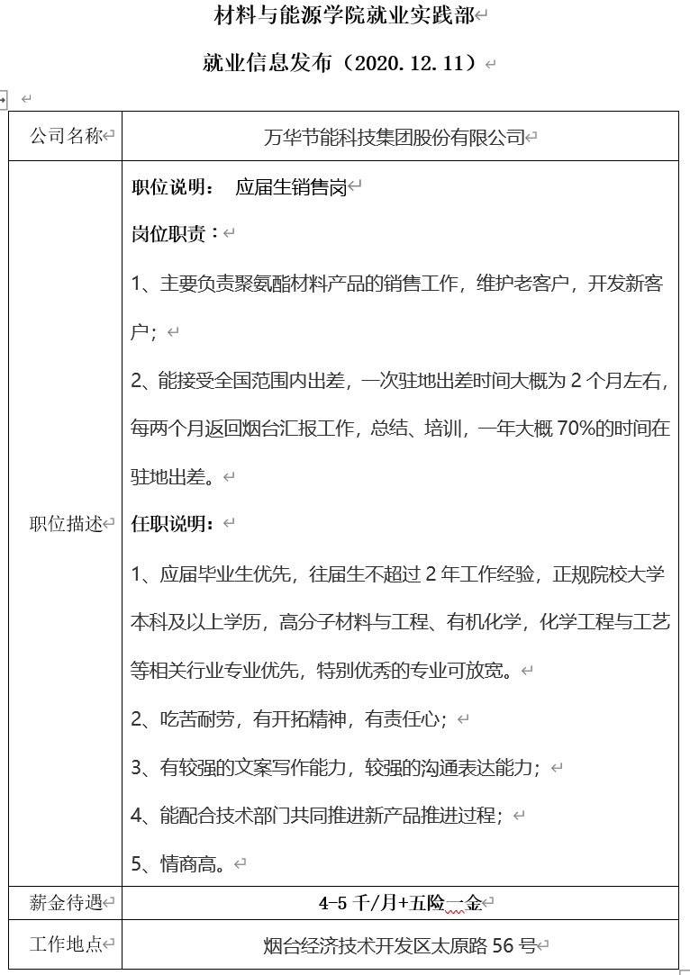 就业信息发布2020.12.11—(万华节能科技集团股份有限公司)