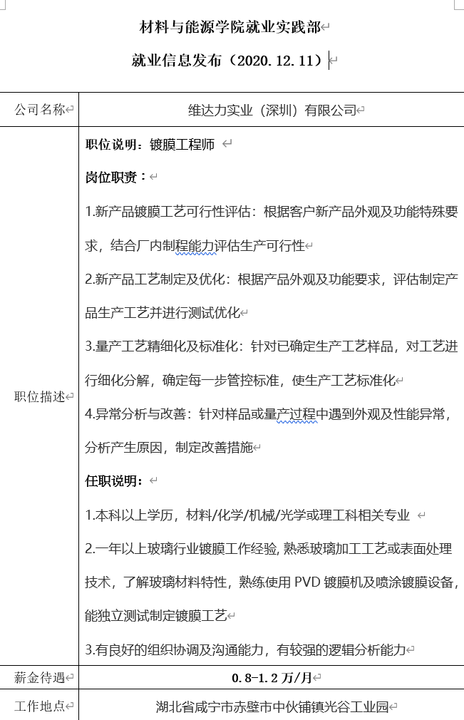 就业信息发布2020.12.11—(维达力实业(深圳)有限公司)