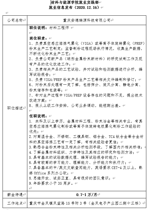 就业信息发布2020.12.16—(重庆安德瑞源科技有限公司)