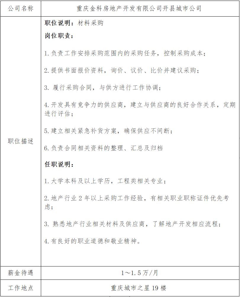 就业信息发布2020.10.26-重庆金科房地产开发有限公司开县城市公司
