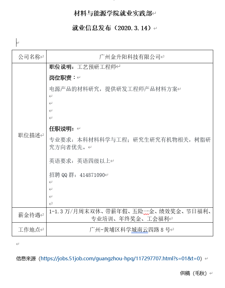 就业信息发布2020.3.14-广州金升阳科技有限公司