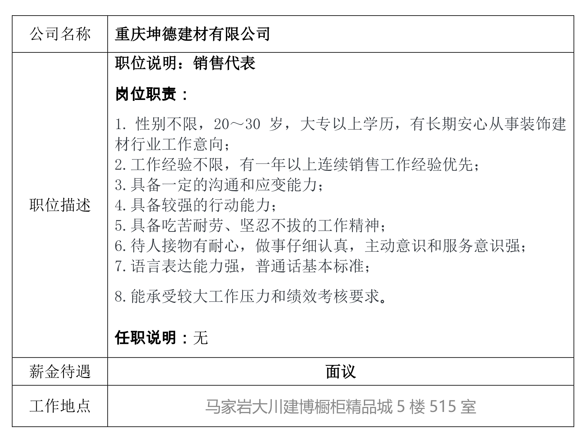 就业创业中心20181120发布-重庆坤德建材有限公司