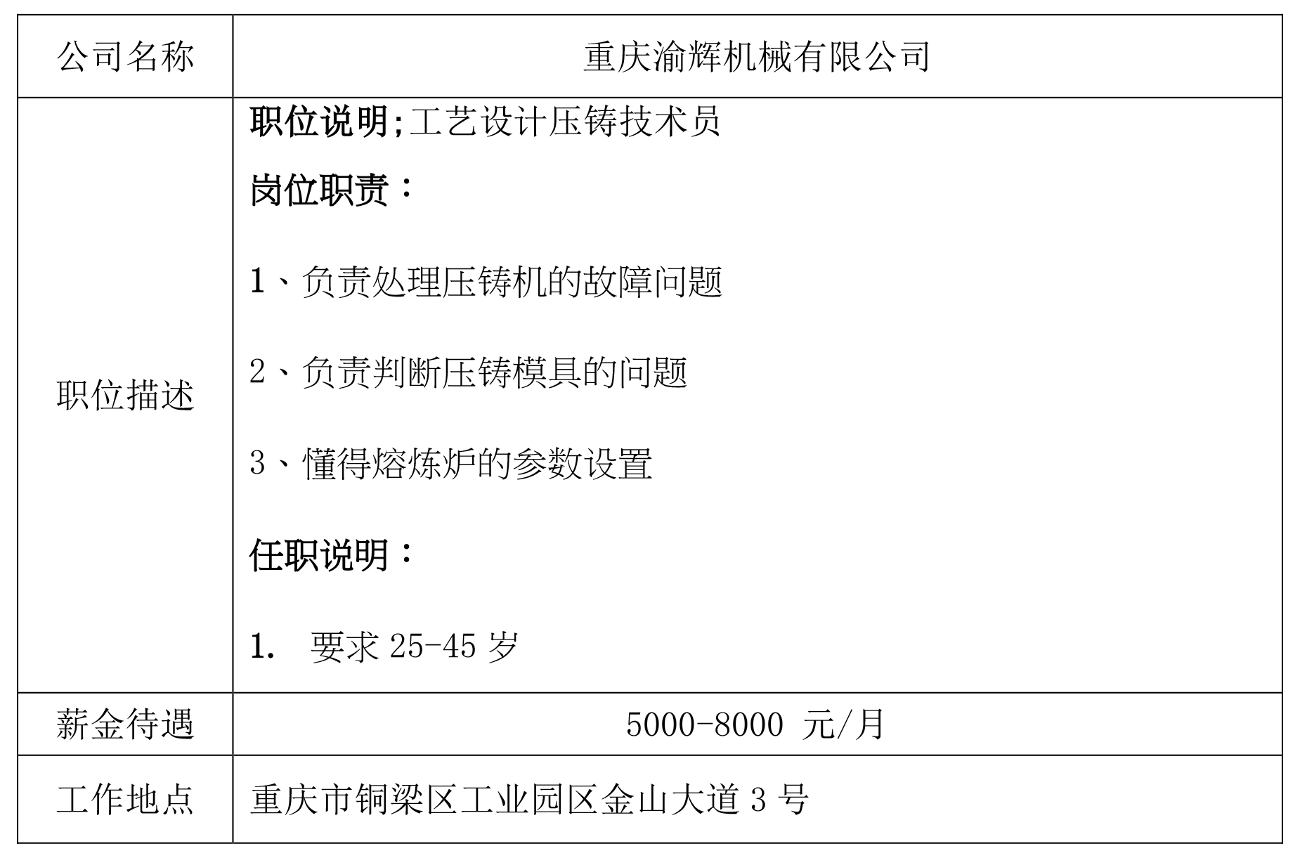 就业创业中心20181015发布-重庆渝辉机械有限公司