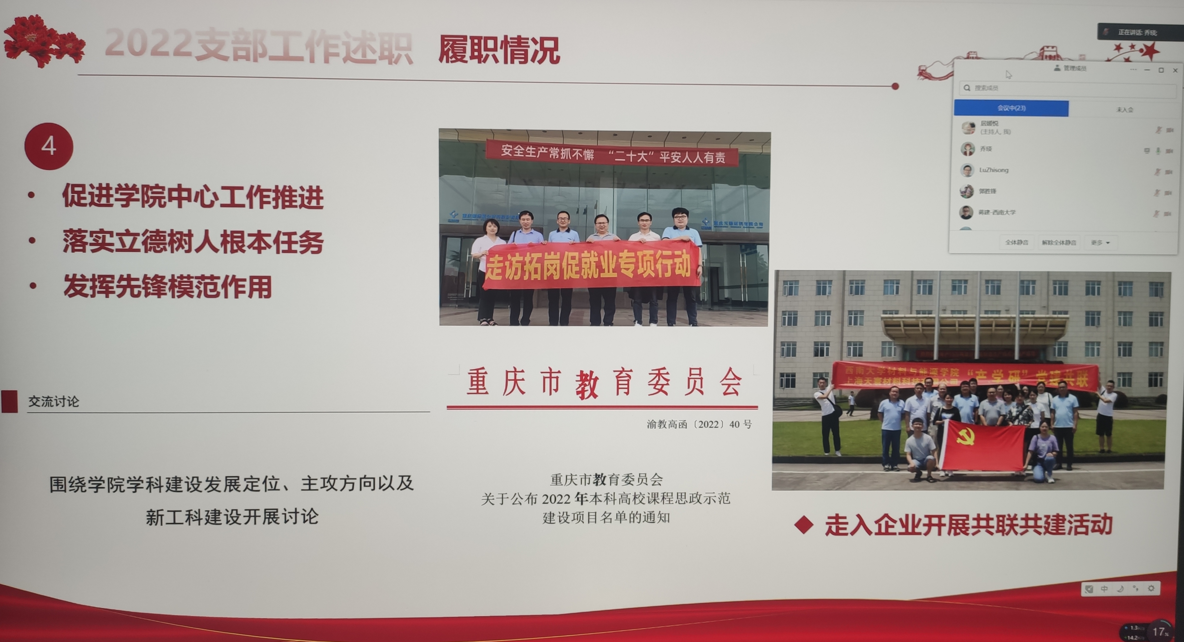 2022年12月29日学院党委2022年度党支部书记抓基层党建述职评议考核在线上召开。学院党委委员、纪委委员、专职组织员、各党支部书记、师生群众代表参加会议,学院党委书记李红同志主持会议。