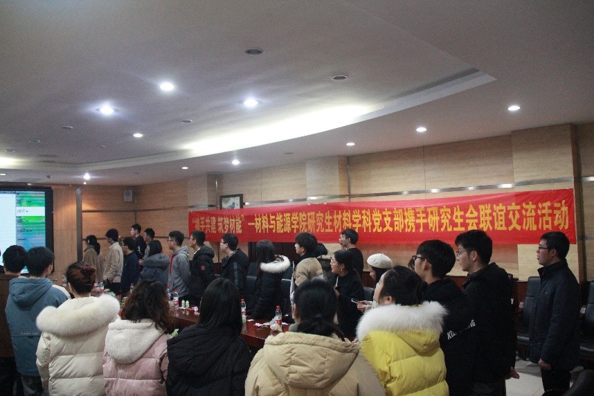 研究生材料学科党支部作为校级样板支部建设,一直把“实践创新、特色发展”作为整个支部的发展思路,不断探索创建更加高效、有序、协调的党研互助体系。1月24日下午15:00-17:00,为丰富研究生材料学科党支部主题党日活动形式、对标对表争创优秀研究生会、加强支部积极分子和研究生干部之间的友谊建设,同时也为加强研究生党员、非党员群众对党的理论知识的共同学习和理解,研究生材料学科党支部携手研究生会在21教105会议室举行了第一届研究生-“党∙研团建”联谊交流活动,本次活动吸引了党支部和研究生会同学们的踊跃参与,同时学院党委副书记、研究生材料学科党支部书记刘昭暾同志也出席了本次活动。