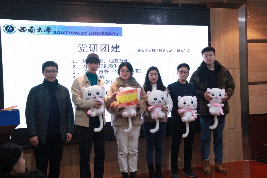 活动最后,研究生材料学科党支部为积分排名靠前的小组颁发了精美的奖品。此外,也给参加的每一位同学发放了精巧的院徽纪念品;同时,大家一起在横幅前拍照留影,在欢笑声中本次的“党∙研团建”活动圆满结束。