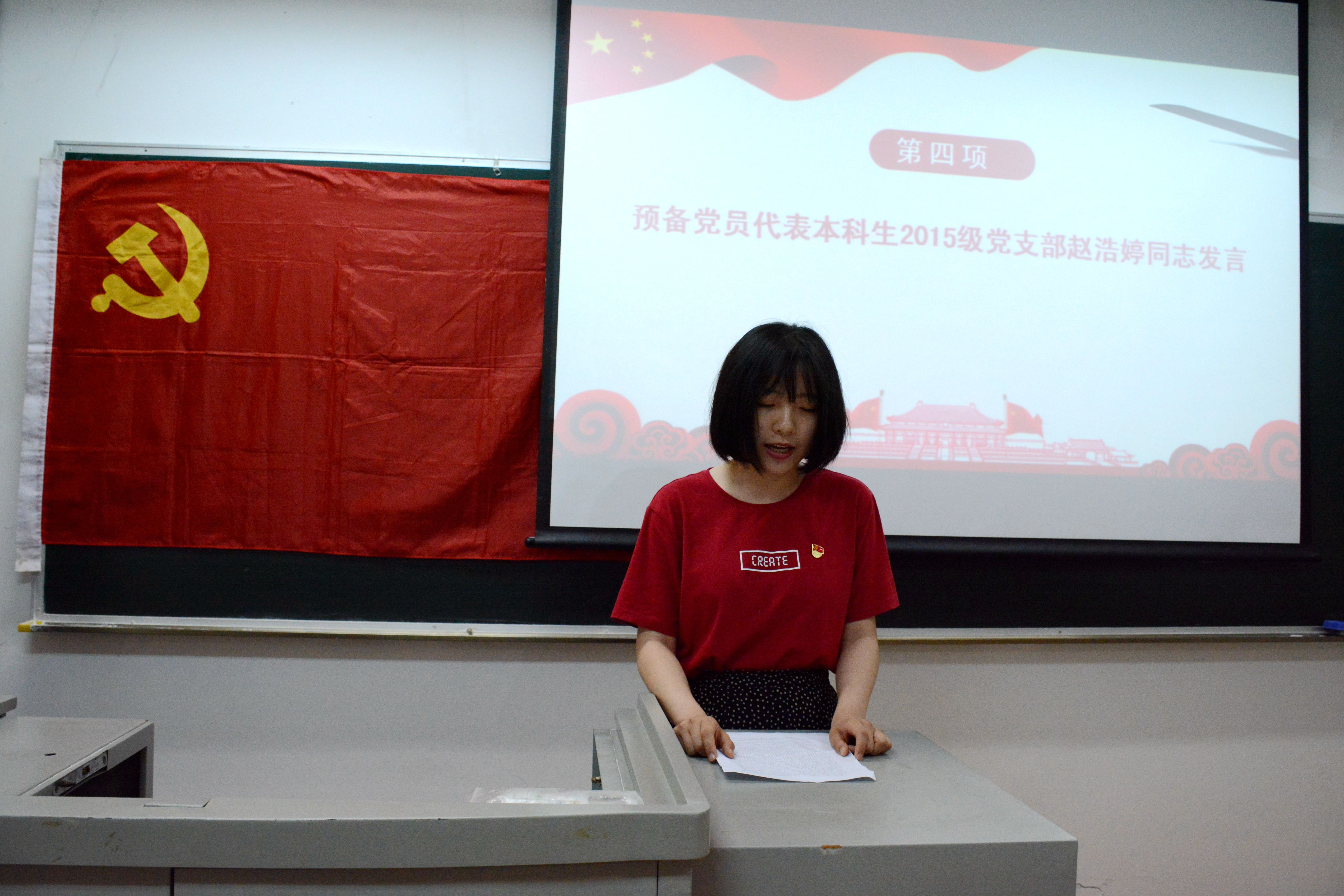 随后,预备党员代表本科生2015级党支部赵浩婷同志发言。她强调只在思想上入党是远远不够的,更要在实际行动上入党。她指出,在党组织的关怀与培养下,她的思想政治觉悟有了很大的提升,自身的能力也得到了提高。她代表全体预备党员,向党组织郑重承诺,他们会用实际行动来履行誓言,为党旗争辉,永远做一名真正的、合格的、光荣的中国共产党员。