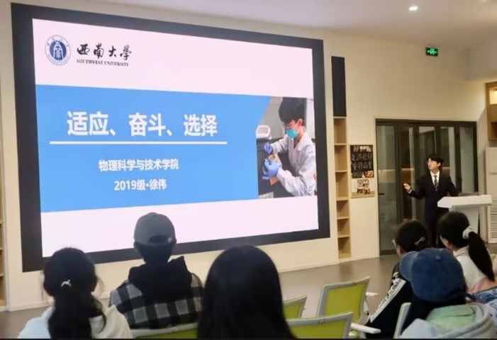 物理科学与技术学院2019级徐伟同学紧接着上台分享了自己的大学时期经历,“适应生活,遇到问题和困难永不言弃”才是大学主旋律,他还告诫同学们学习没有途径,唯有奋斗,在创新的锻造台上千锤百炼方能成就自我。