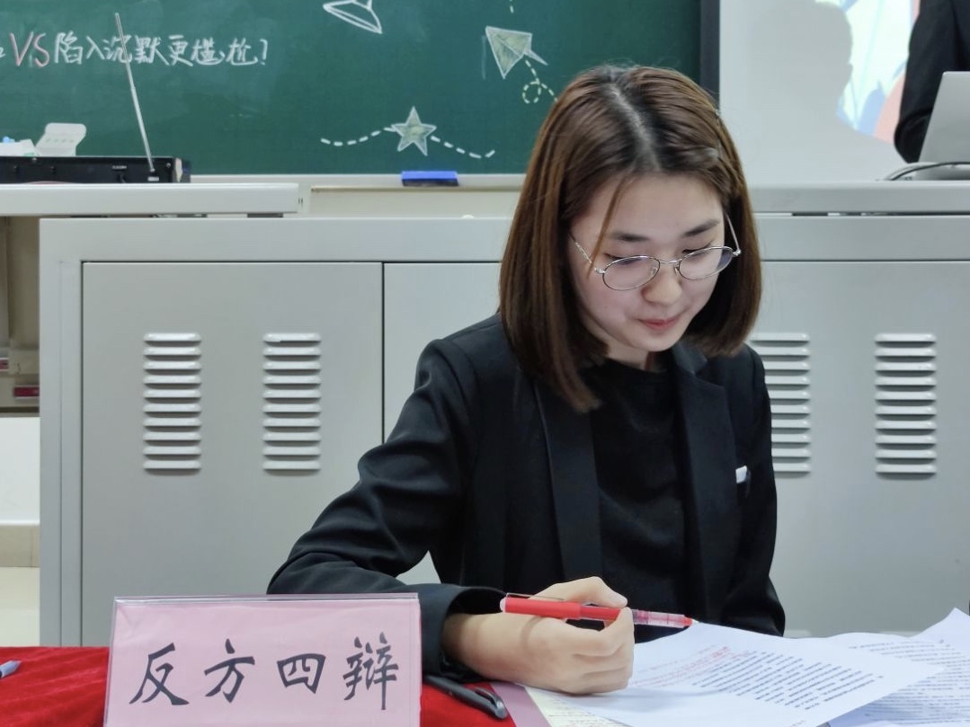 接着反方四辩质询,整个赛场开始就变得紧张又激烈。反方一辩陈词没话找话的目的,列举事例,反面论证,强调持续的沉默会更尴尬。