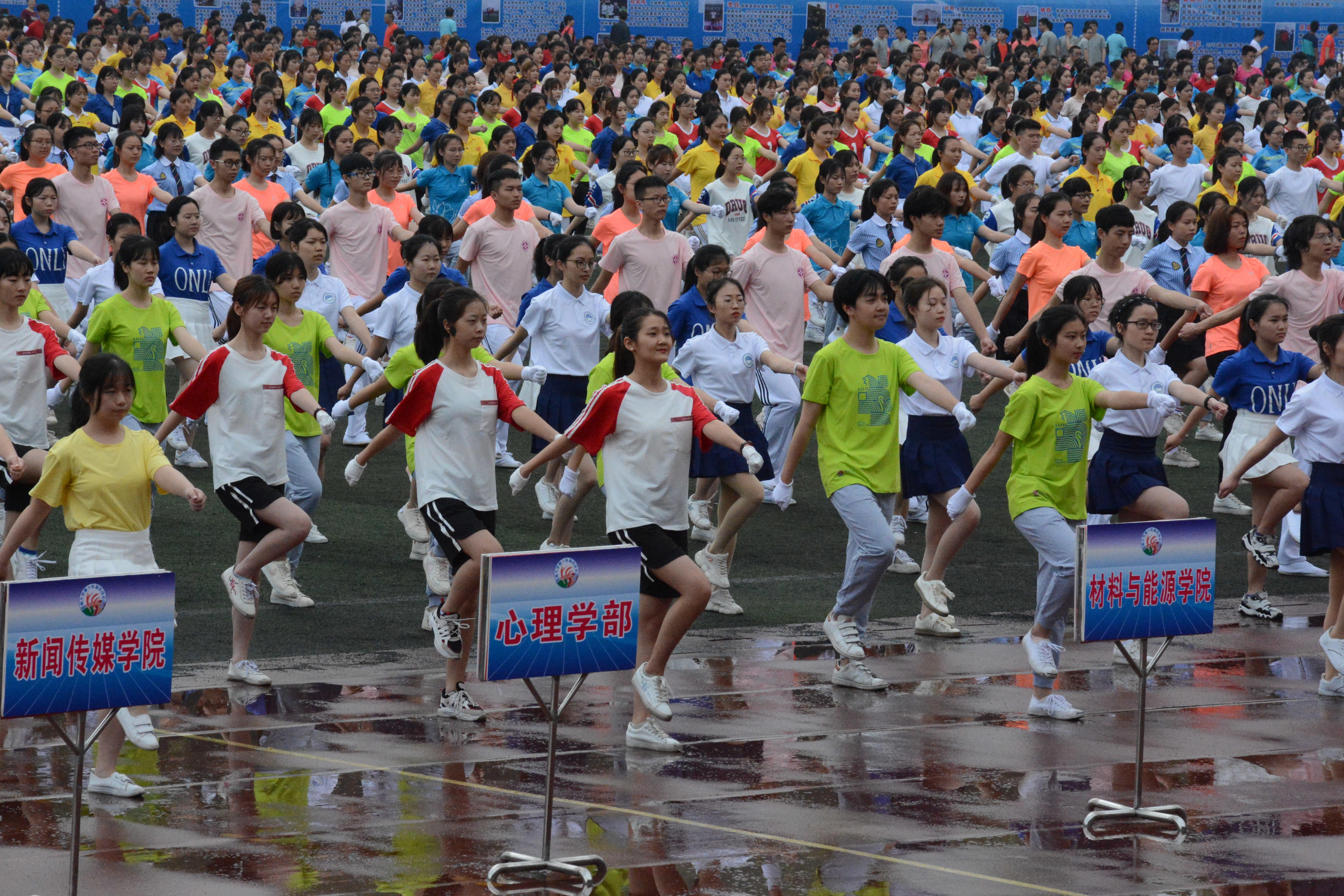领导致辞结束后,先是由老师组成的体操方阵进行体操汇演,之后是来自全校各个学院的体操队伍列队表演。我院学子服装整齐、口号洪亮、精神抖擞、步伐矫健,随着雄壮有力的节奏,同学们动作标准、有力、优美,在这个展示团队青春活力的平台上,赛出了风格,赛出了水平,赛出了形象,展现出活泼开朗、健康向上的精神风貌。