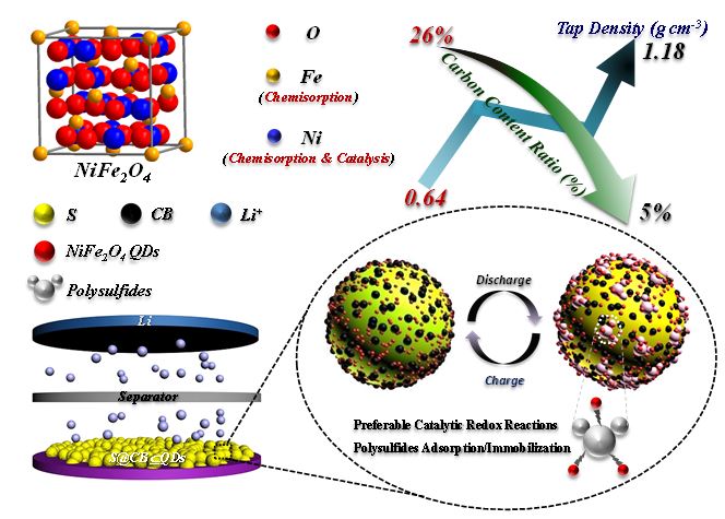 近日,太阳成集团tyc539蒋建课题组提出了一种正极引入多功能NiFe2O4量子点以最小化碳使用量的设计方案,文章第一作者为研究生二年级学生李宁,该工作成功发表在《Nano-Micro Letters》上,标题为“Curtailing Carbon Usage with Addition of Functionalized NiFe2O4 Quantum Dots: Toward More Practical S Cathodes for Li-S Cells”。该成果表明,引入的NiFe2O4量子点具有良好的导电性、高的振实密度 (~1.32 g cm-3)、低的比表面积 (~19.9 m2 g-1)且对多硫化物具有极好的化学吸附和催化作用。同时,选用NiFe2O4量子点作为碳添加剂替代品,使正极整体碳含量降低到5%水平,从而避免电解液的过度消耗,确保特定能量密度参数。为了验证NiFe2O4量子点的多功能化,我们特意在不加LiNO3电解液情况下评估了电池的电化学性能。代表性示意图如下所示: