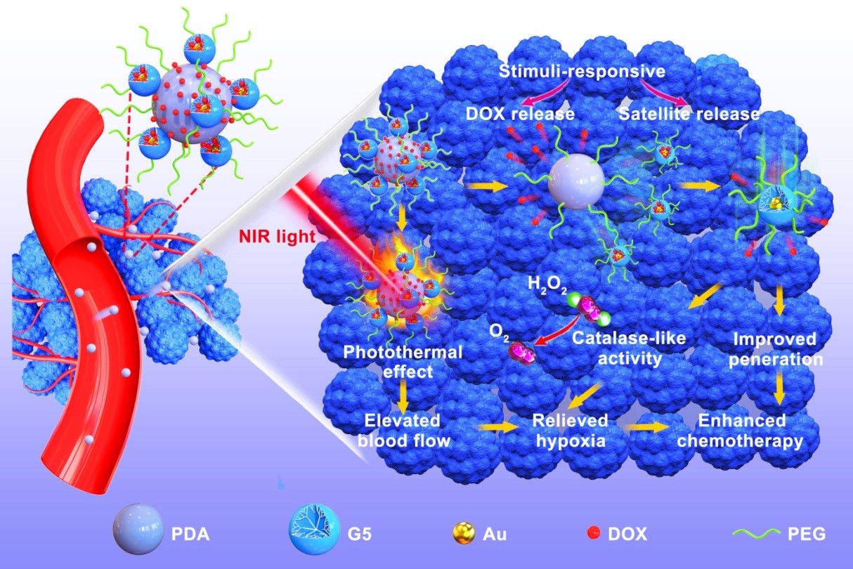 化学治疗是临床上广泛使用的一种肿瘤治疗手段。所用化学药物必须到达肿瘤部位,才能充分发挥其治疗效果。但由于大多数抗癌药物自身的性质(如血池代谢速度快和水溶性差等)和实体瘤本身的特点(如乏氧和间质密度过高等),治疗往往很难达到预期效果。本工作中,为了提高治疗效果,作者设计并构建了“核-卫星”结构的载药聚多巴胺/树状大分子-金复合纳米颗粒,包括:制备聚多巴胺(PDA)纳米颗粒为“核”;制备树状大分子-金(G5Au)纳米颗粒为“卫星”;将G5Au纳米颗粒修饰到PDA纳米颗粒表面;随后进行聚乙二醇(PEG)修饰;最后进行抗癌药物阿霉素(DOX)负载,得到PDA-G5Au-PEG@DOX复合纳米颗粒。