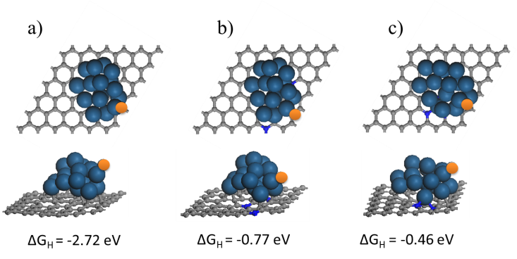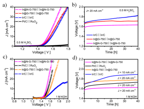 电解水制氢是通往可持续氢能源的重要一环。由于析氢(hydrogen evolution reaction, HER)和析氧(oxygen evolution reaction, OER)两个半反应的动力学迟缓,电解水制氢技术目前存在着能量转换效率低、催化剂成本高等难点。在本研究中,课题组选用氮掺杂石墨烯为载体材料,负载贵金属铱超小纳米颗粒(直径2.18±0.92 nm负载量3.21 wt%)。该催化剂在酸性和碱性条件下都表现出优异的析氢和析氧催化活性和稳定性,作为双功能催化剂用于全电解水反应时,可在1.6V槽压下实现稳定的20 mA cm-2电解水。进一步的实验和理论研究表明:这一催化剂中存在丰富的铱-氮配位作用和金属-载体间电荷转移,调制了金属铱电子结构,从而提高了催化活性和稳定性。