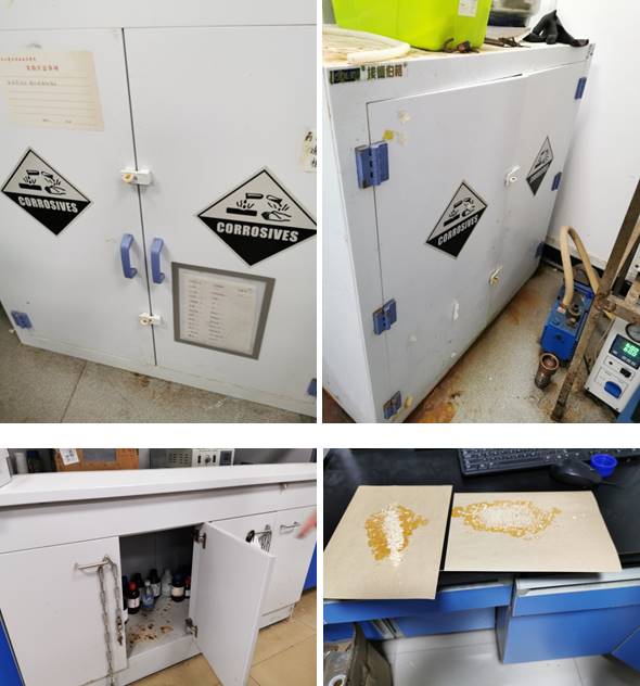 3. 化学药品柜未使用双锁,实验后没有及时将药品柜锁上,以及化学药品清单不清晰。