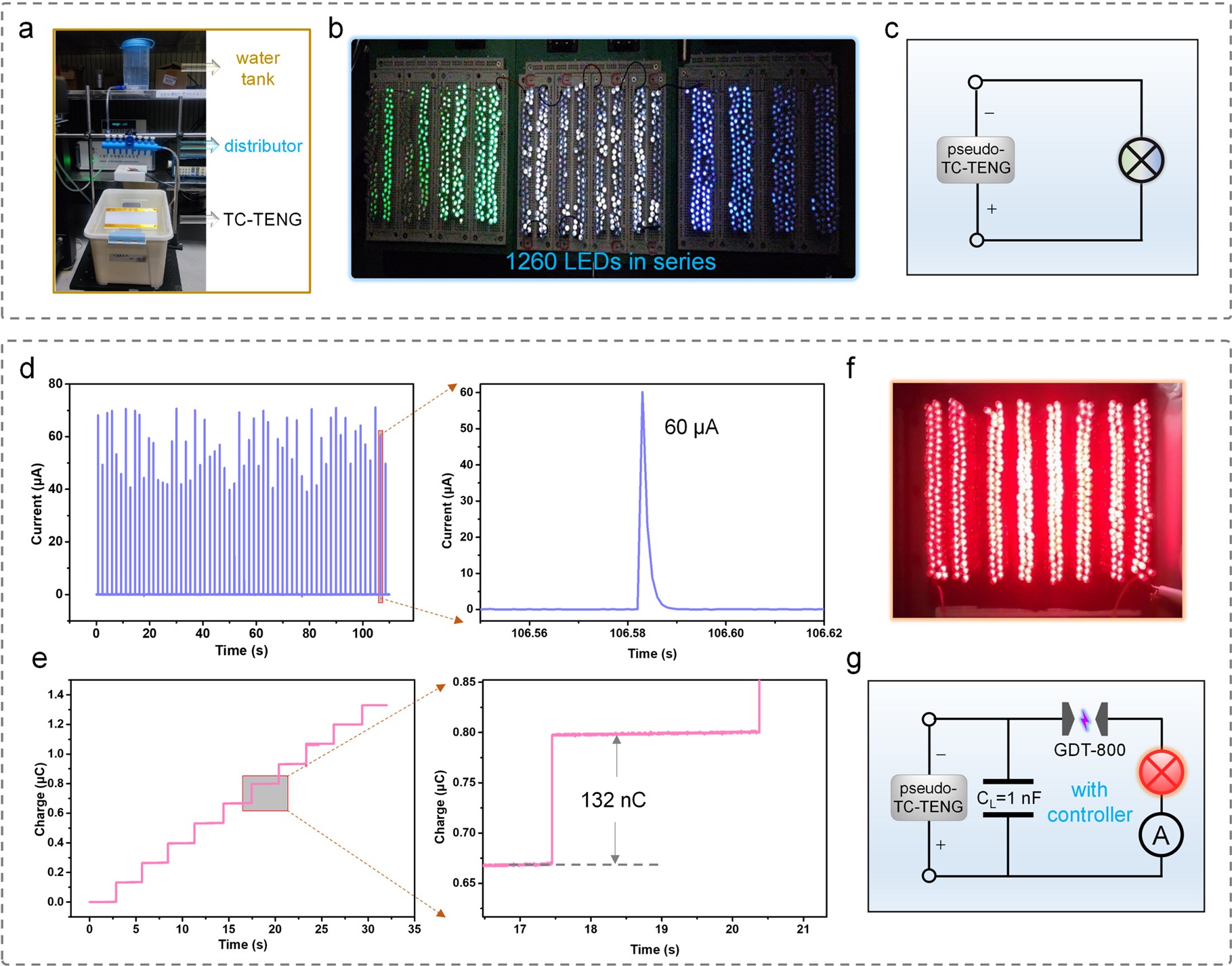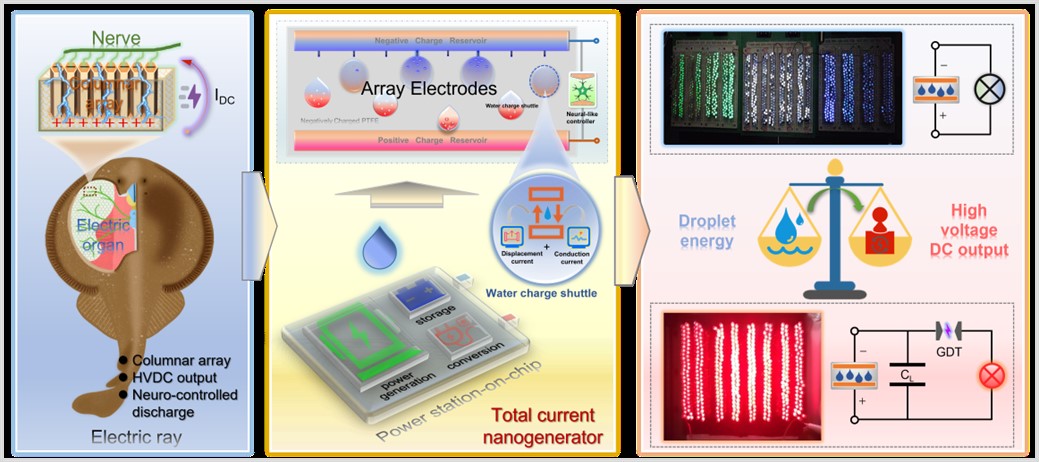近日,宋群梁教授课题组与重庆大学郭恒宇教授合作,在国际知名期刊Energy & Environmental Science上发表题为“A bio-inspired total current nanogenerator”的研究文章。该工作受到电鳐启发,研制了一种高性能直流液滴纳米发电机。不同于经典的位移电流纳米发电机,该纳米发电机利用位移电流和传导电流共同作为驱动力,无需整流器即可输出高压直流电。这个新概念器件被定义为全电流纳米发电机,它具有紧凑阵列架构、高压直流输出、可控能量释放等特点,成功实现了如同电鳐一般瞬间释放“高压电击”的这一能力。由于该纳米发电机的输出电压高达3000伏,一次放电足以点亮1260多盏高亮LED,展示了其无与伦比的高熵水能采集能力。本研究提出的全电流纳米发电机有可能同时满足高性能、小型化、低成本、长寿命的应用要求,这将极大地促进分布式水能收集的实际应用。同时,该工作为基于固液接触起电的TENG理论和技术提供了新的见解,有望促进纳米发电机从器件级到系统级的研究范式转变。更重要的是,这项工作中提出的全电流概念并不局限于TENG,而是可以扩展到更广泛的能量采集器件,从而有可能在未来创造新的能量采集技术。