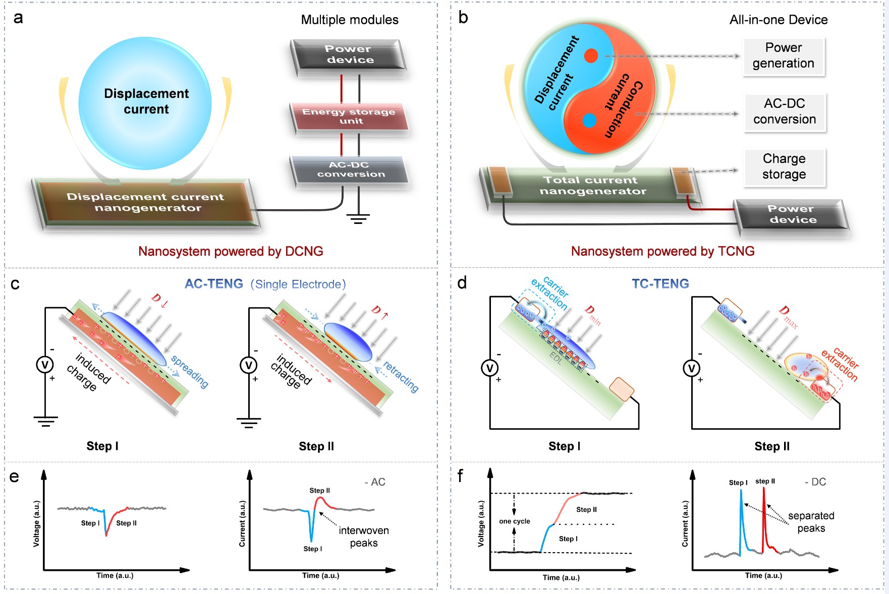 图2:基于位移电流和全电流纳米发电机的纳米能源系统对比以及TC-TENG的输出性能演示。
