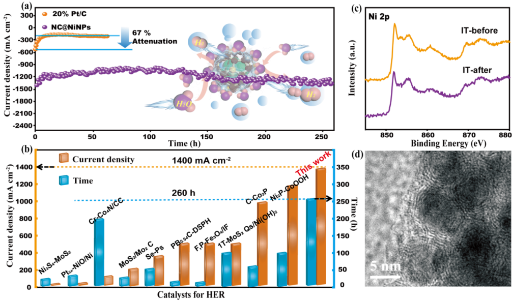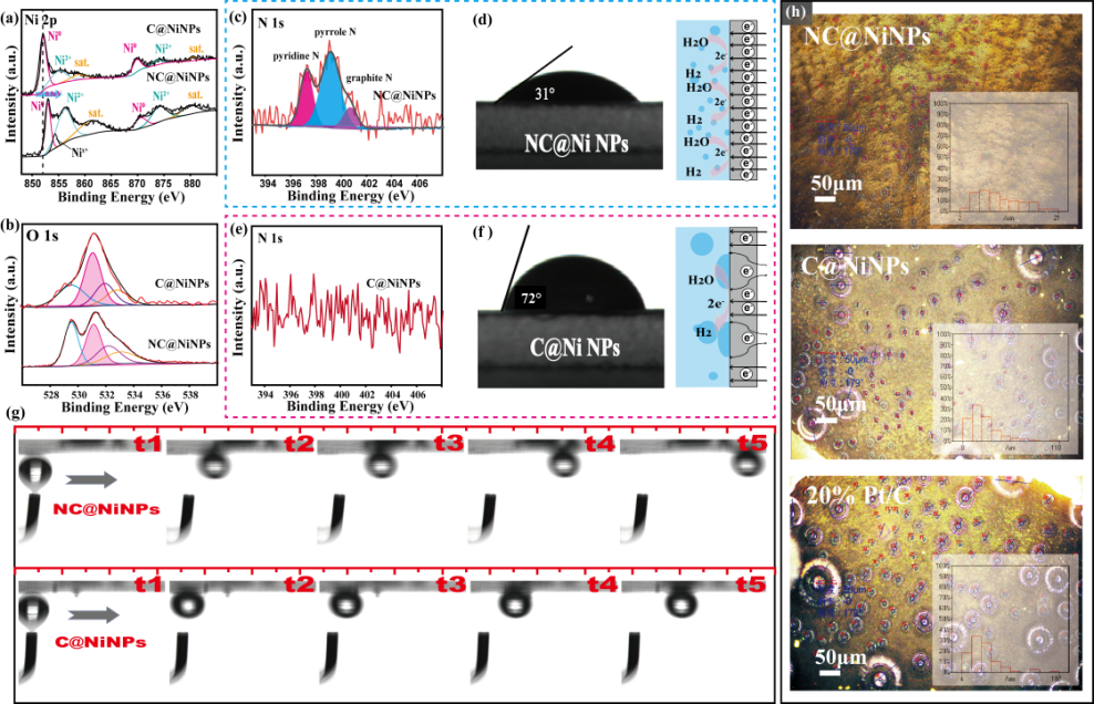 我们采用原位检测手段观察了气泡在催化剂表面的成核、生长和迁移行为,这是我们研究的重点,也是这个工作的亮点之一。实验结果表明,在亲水的NC@NiNPs表面形成的气泡尺寸更小,迁移速度更快,从而有效降低了气泡的掩蔽效应和机械震荡,极大地提高了大电流密度下催化剂的活性和稳定性。