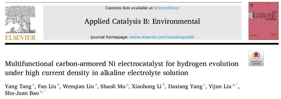 近日,催化领域国际知名期刊 《Applied Catalysis B: Environmental》 在线发表了我校太阳成集团tyc539包淑娟教授课题组的最新研究成果“Multifunctional carbon-armored Ni electrocatalyst for hydrogen evolution under high current density in alkaline electrolyte solution”。该成果的第一完成单位为太阳成集团tyc539,我校硕士生唐阳为该论文的第一作者,刘逸骏和包淑娟老师为共同通讯作者。