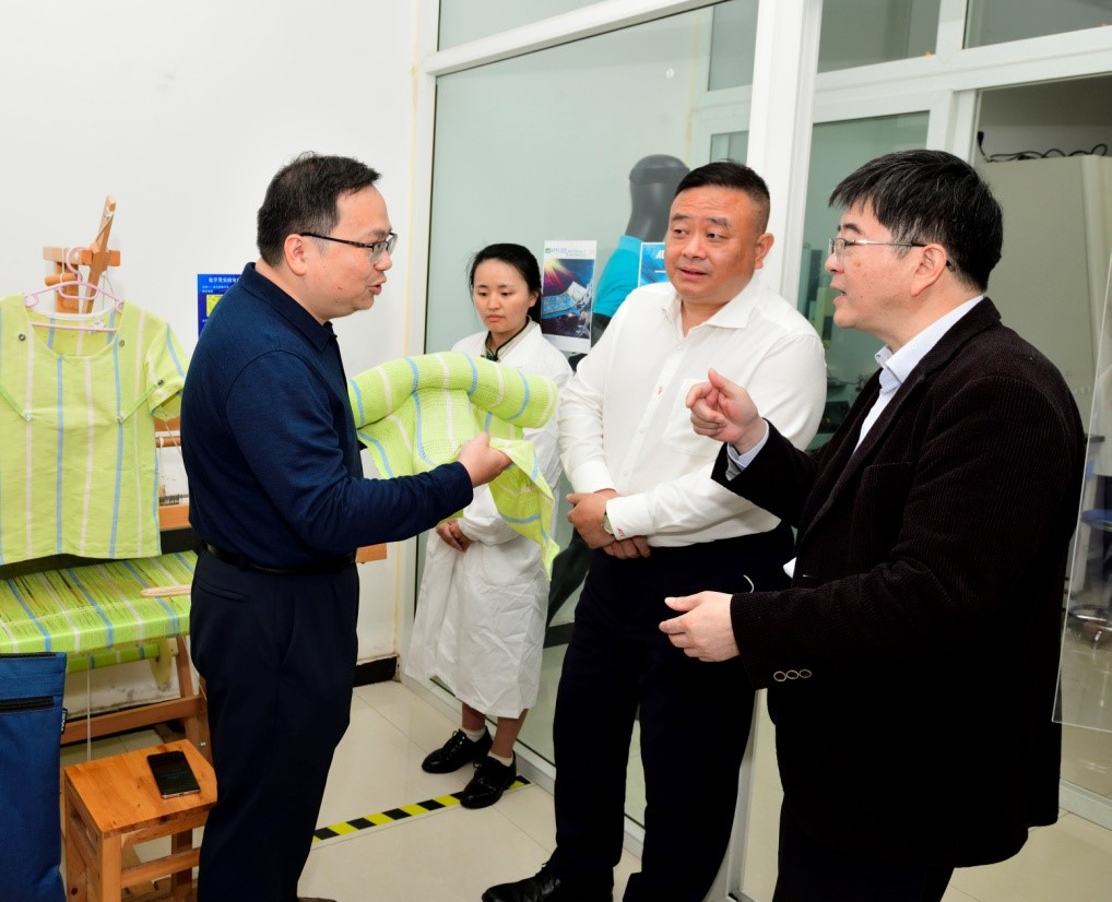 马主任和李书记一行首先参观了我院鲁志松教授课题组可穿戴智能纤维实验室,鲁志松教授就本课题组在柔性纤维基汗液激活电池、柔性纤维基拉伸应变传感器方面所取得的成就做了简要介绍,并就其在军用能源供给、人体运动状态监测方面的应用潜力进行了说明。马主任详细了解了柔性纤维基汗液激活电池以及拉伸传感器所用的材料、制造方法、具体应用场景以及后期的数据采集等等,并对这些研究成果给予了高度的赞许。
