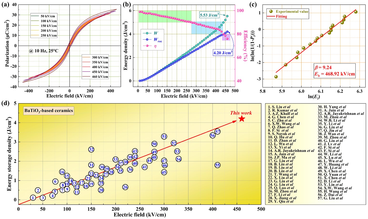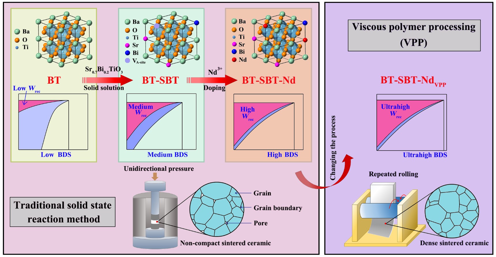 钛酸钡(BaTiO3, BT)陶瓷是电子陶瓷的工业支柱,但因大的剩余极化(Pr)和低的介电击穿场强(BDS),造成其储能密度非常有限,难以满足电力电子设备小型化、轻量化的发展要求。为提高钛酸钡基陶瓷的储能密度,该工作利用固溶、掺杂手段破坏了铁电宏畴(纳米畴工程),有效降低了剩余极化和矫顽电场,并结合工艺优化提高了陶瓷的击穿电场强度,从而极大地提高了BT基无铅陶瓷的储能性能。