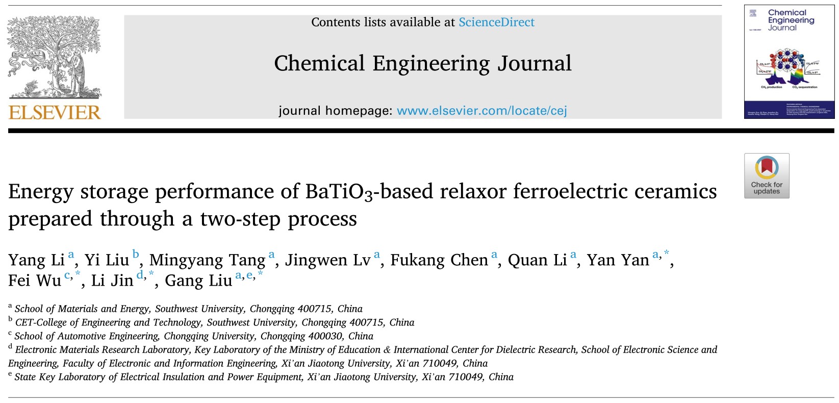 近日,刘岗教授课题组在钛酸钡基弛豫铁电体陶瓷研究领域取得进展。相关成果以“Energy storage performance of BaTiO3-based relaxor ferroelectric ceramics prepared through a two-step process”为题再次发表在国际知名期刊《Chemical Engineering Journal》上。太阳成集团tyc539为该成果第一完成单位,重庆大学和西安交通大学为共同完成单位。