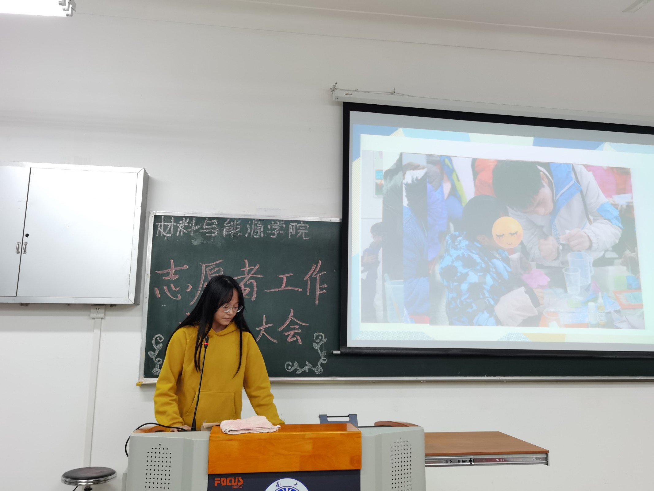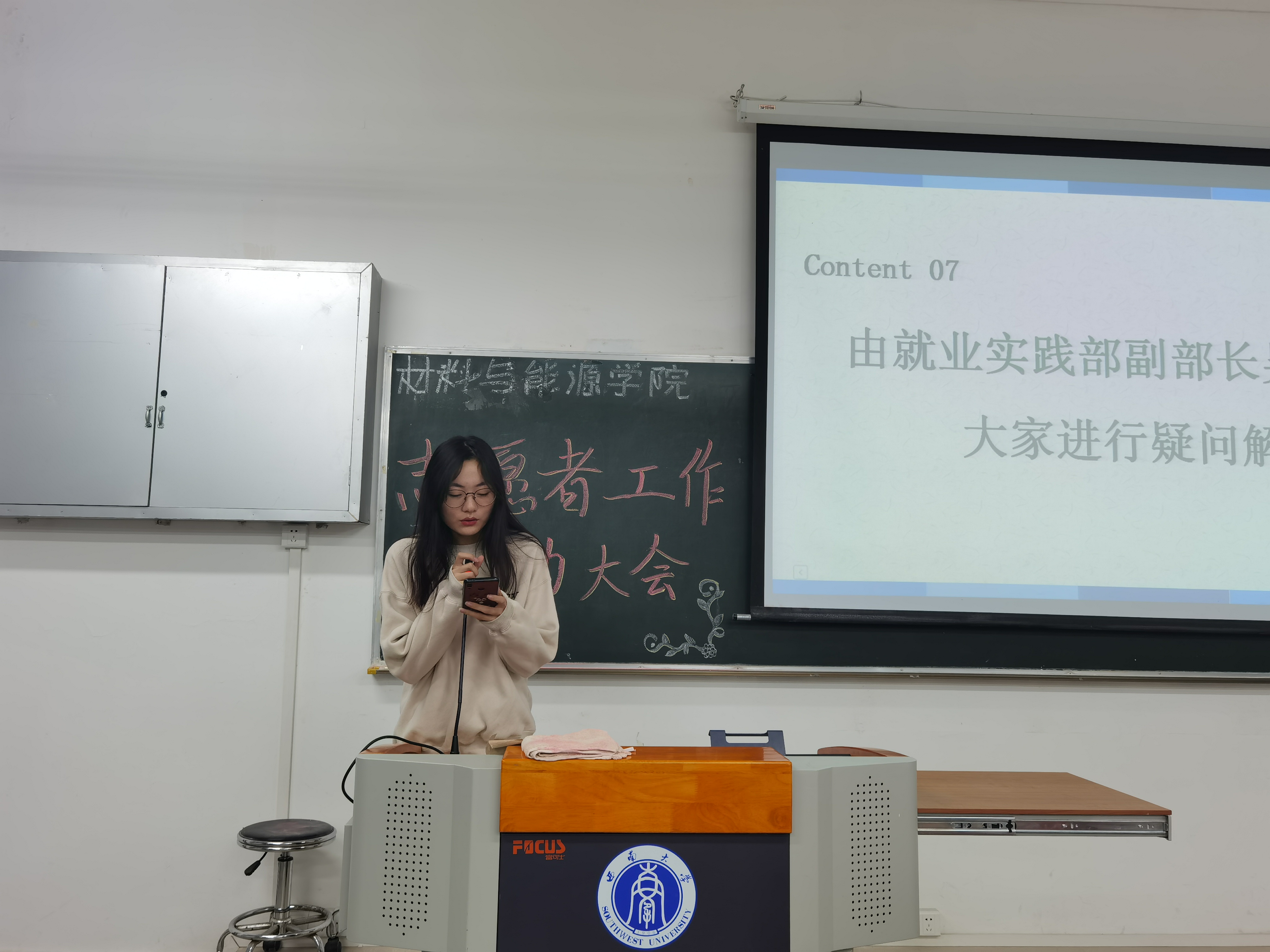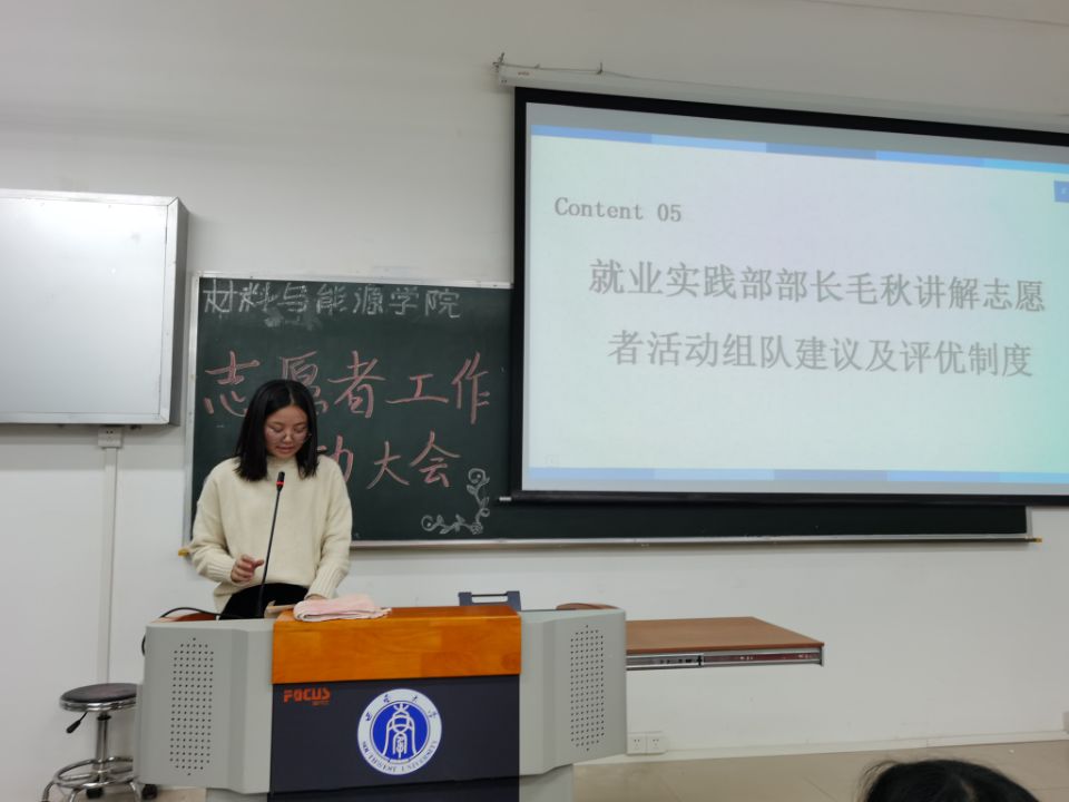 其次,就业实践部部长毛秋讲解志愿者活动组队建议以及评优制度,确保志愿者活动能有条不紊地进行着。