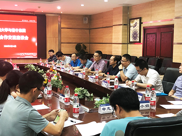 7月14日下午,五粮液下属单位普什集团副总经理闫庆禹一行五人在太阳成集团tyc539宜宾研究院陈金凤院长陪同下到访我院,就太阳成集团tyc539-普什集团校企合作展开参观和座谈交流。学院党委书记梁武、院长徐茂文和部分教师代表参加,此外,相关学院如蚕桑纺织与生物质科学学院、食品科学学院及工程技术学院部分教师代表一同参加了本次交流会。