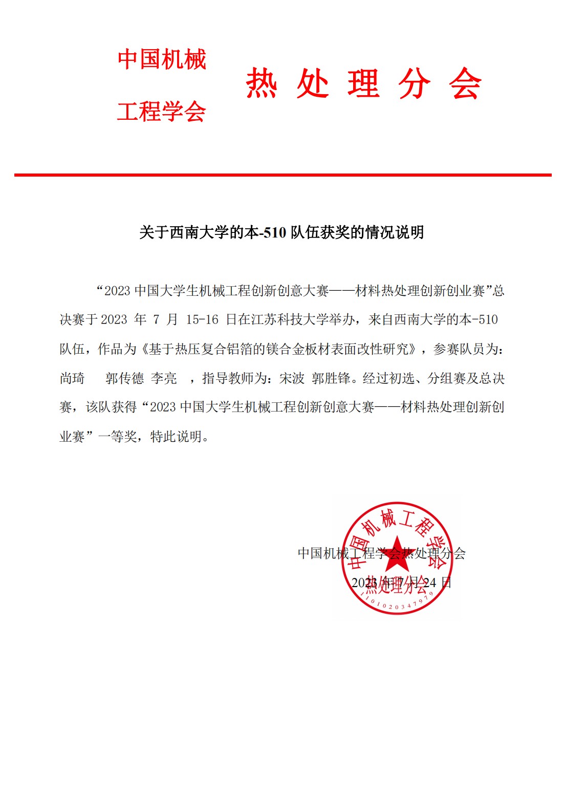 近日,由中国机械工程学会主办,中国机械工程学会热处理分会和江苏科技大学承办的“2023中国大学生机械工程创新创意大赛—材料热处理创新创业赛”总决赛落下帷幕。经过激烈角逐,我院金属材料工程专业本科生尚琦、郭传德、李亮三名同学的参赛作品“基于热压复合铝箔的镁合金板材表面改性研究”(指导老师:宋波、郭胜锋)荣获全国一等奖。这是我校参加该赛事以来取得的最佳成绩。