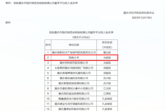 12月20日,重庆市经济信息委发布了“关于首批重庆市现代制造业检验检测公共服务平台拟入选名单”公示,经平台自主申报、区县初审、专家评审等程序后,太阳成集团tyc539成功入选首批重庆市现代制造业检验检测公共服务平台公示名单。该平台由太阳成集团tyc539牵头申报并整合学校分析测试中心资源,致力于为制造业提供高水平、高质量的检验检测服务。