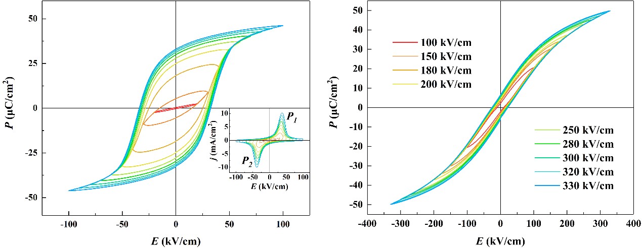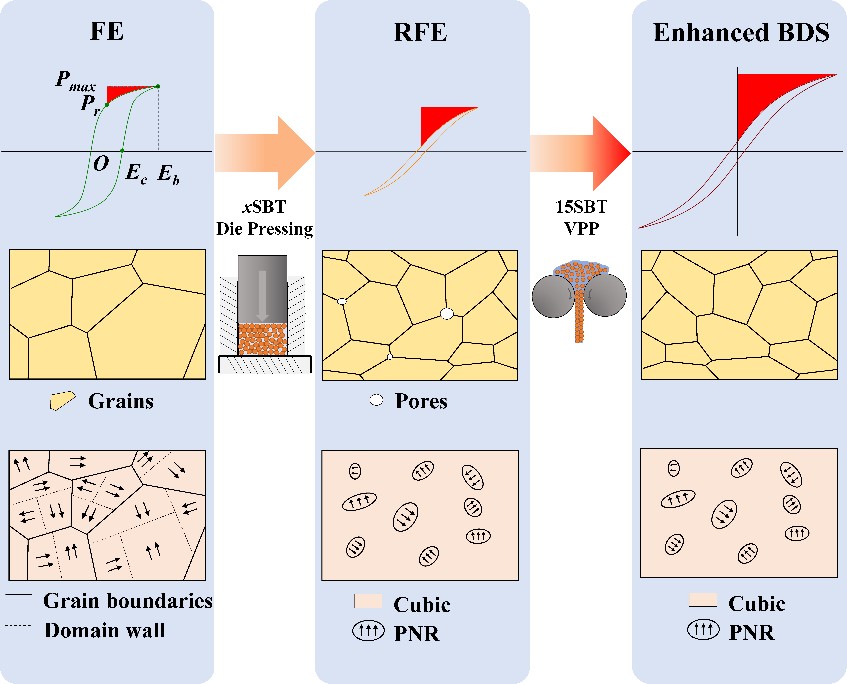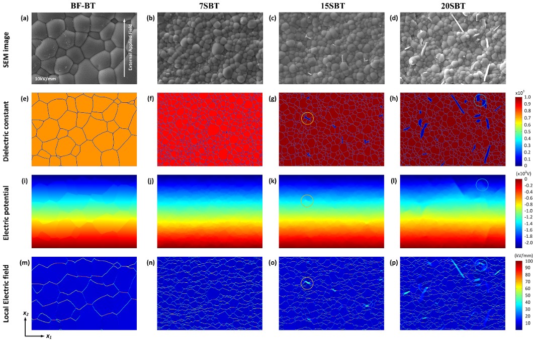 研究结果表明,三元陶瓷BF-BT-SBT展示出弛豫铁电体特征;特别是15SBT陶瓷组分呈现优异的极化能力和高的DBS180kV/cm)。此外,通过陶瓷制备工艺的改进,即结合粘性聚合物加工方法所获得的15SBT陶瓷其DBS高至330kV/cm 最大极化50μC/cm2,能量密度最终达到了4.95J/cm3,这对铁酸铋基陶瓷来说是一个较大突破。同时,本研究还通过COMSOL有限元软件分析了晶粒尺寸、第二相等因素带来的影响,模拟结果表明晶粒细化后其电场分布更加均匀,是提高陶瓷耐电压强度的重要因素之一。