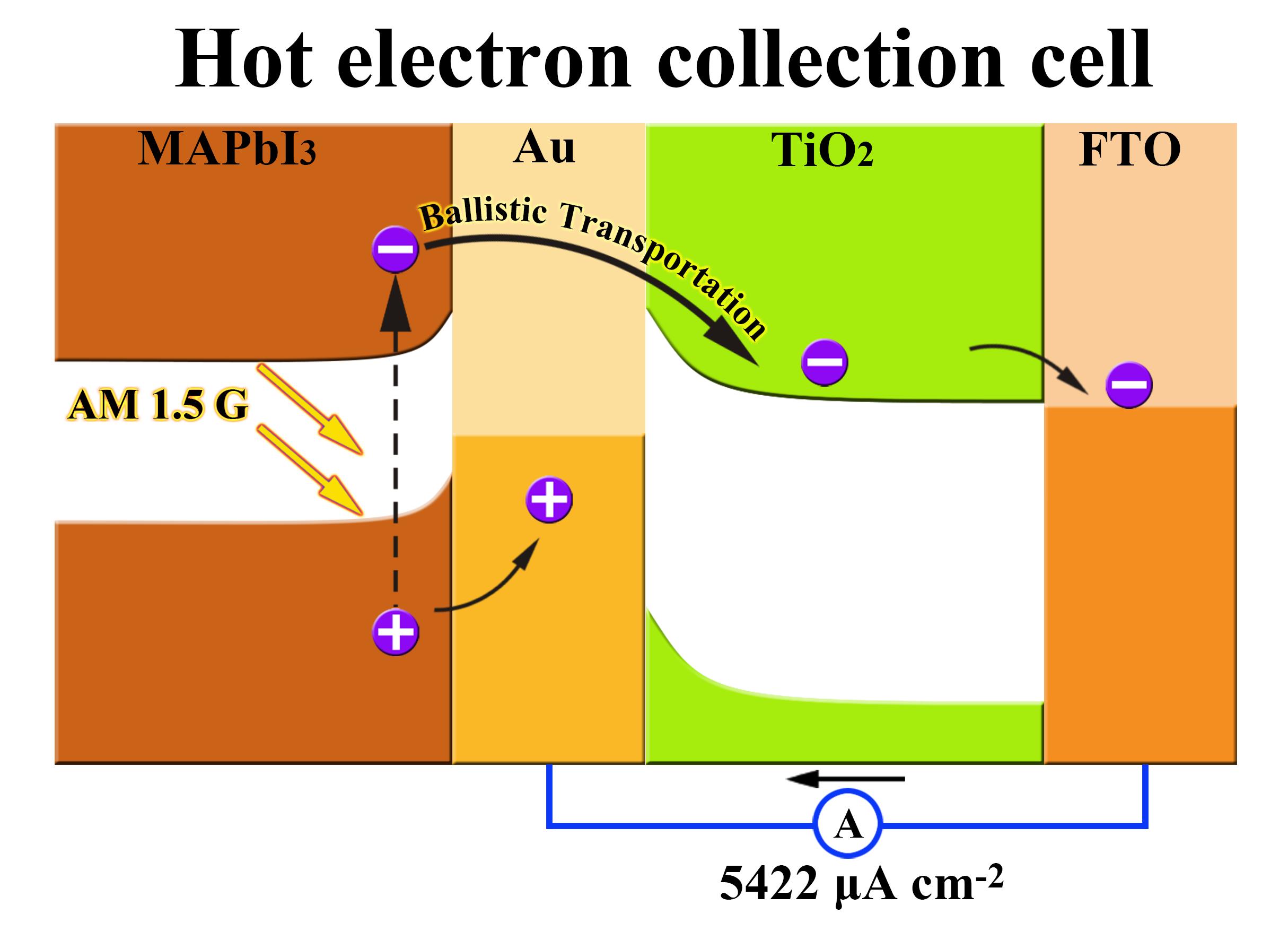 为了实现在稳态光照下收集利用热载流子,宋群梁教授课题组设计了一种新的内发射热载流子(IPHC)太阳能电池的结构(CH3NH3PbI3/Au/TiO2/FTO)。在这种新型结构中,钙钛矿吸光层位于两个收集电极的外。只有高能的热电子才能越过钙钛矿与金电极之间的势垒,并穿越金电极到达TiO2导带,最终被外电路收集形成光电流。这种新结构热载流子电池在标准太阳光(100 mw·cm-2)照射下产生了5422 μA·cm-2的短路电流。这是首次在实验上实现稳态光照下热电子的收集利用。